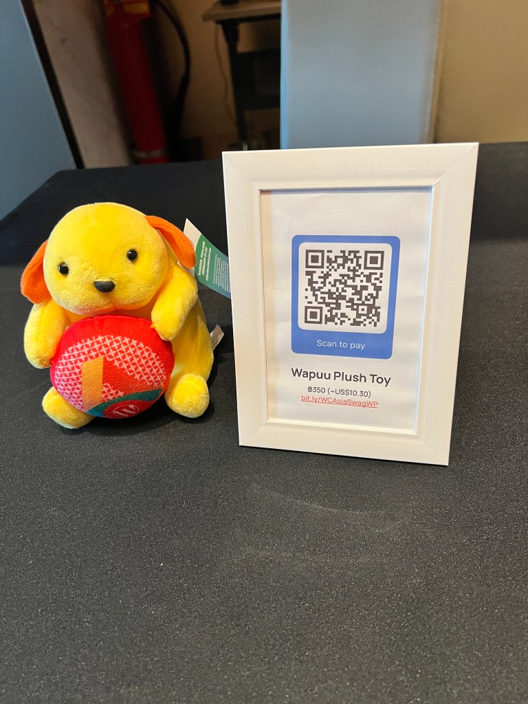 To purchase a Wapuu or fan, you would need to scan a QR code located on the table, pay with your credit card through Stripe, and you’re good to go!